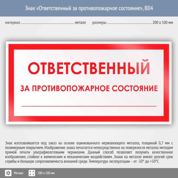 Знак «Ответственный за противопожарное состояние», B04 (металл, 200х100 мм) в Альметьевске купить