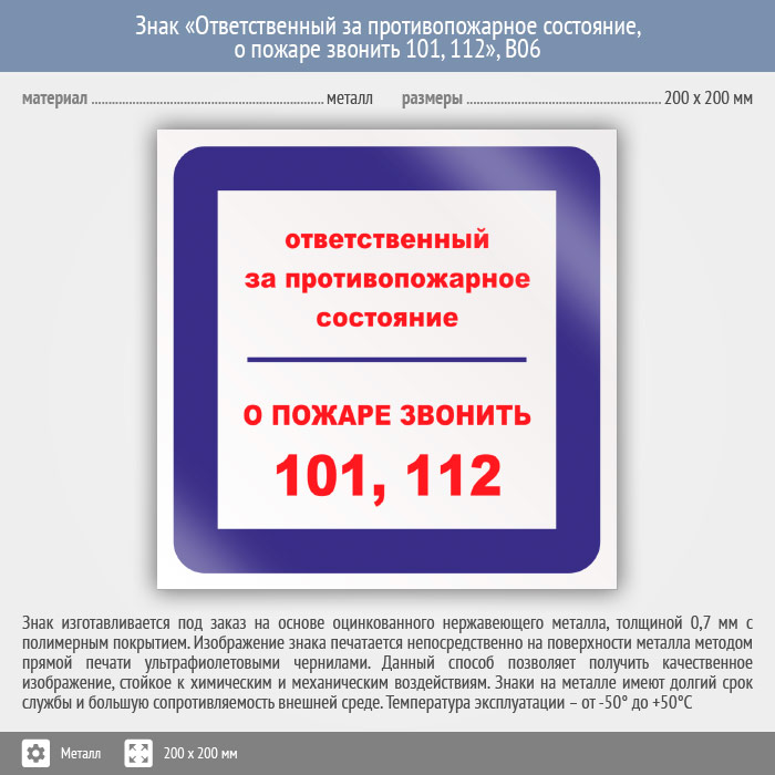 Знак «Ответственный за противопожарное состояние, о пожаре звонить 101, 112», B06 (металл, 200х200 мм) в Альметьевске купить