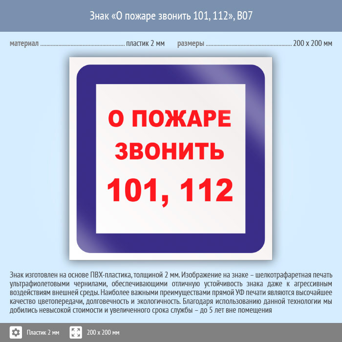 Знак «О пожаре звонить 101, 112», B07 (пластик, 200х200 мм) в Альметьевске купить