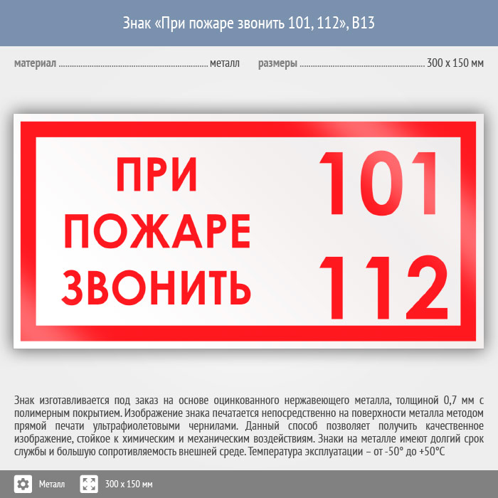 Знак «При пожаре звонить 101, 112», B13 (металл, 300х150 мм) в Альметьевске купить