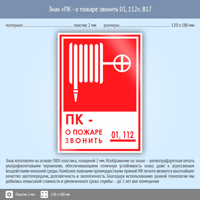 Знак «ПК - о пожаре звонить 01, 112», B17 (пластик, 120х180 мм) в Альметьевске купить