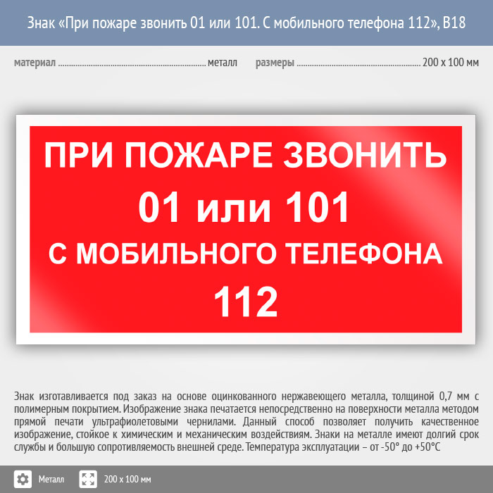 Знак «При пожаре звонить 01 или 101. С мобильного телефона 112», B18 (металл, 200х100 мм) в Альметьевске купить