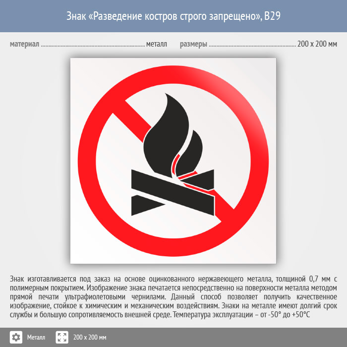 Знак «Разведение костров строго запрещено», B29 (металл, 200х200 мм) в Альметьевске купить