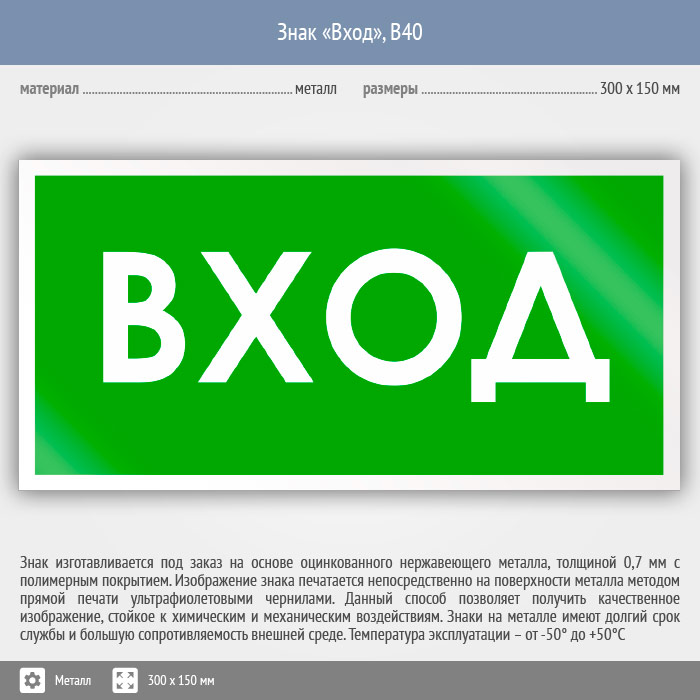 Знак «Вход», B40 (металл, 300х150 мм) в Альметьевске купить