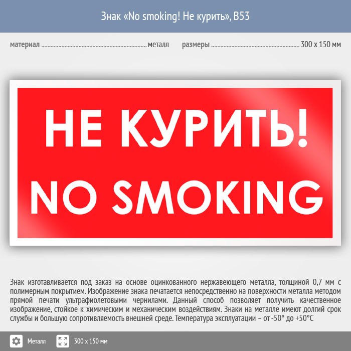 Знак «No smoking! Не курить», B53 (металл, 300х150 мм) в Альметьевске купить