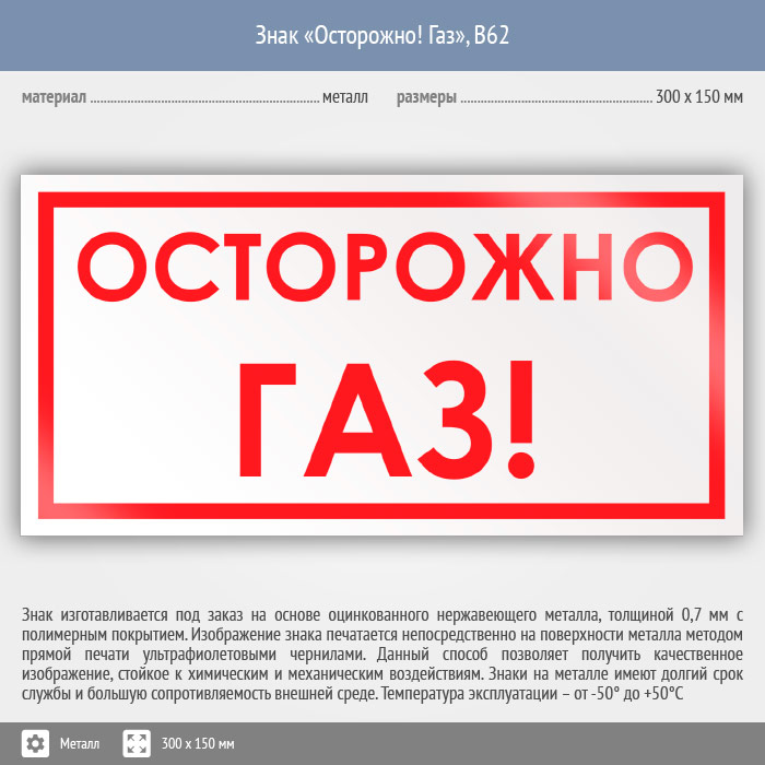 Знак «Осторожно! Газ», B62 (металл, 300х150 мм) в Альметьевске купить