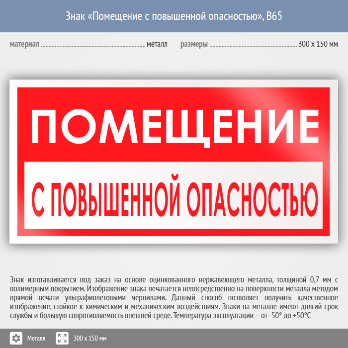 Знак «Помещение с повышенной опасностью», B65 (металл, 300х150 мм) в Альметьевске купить
