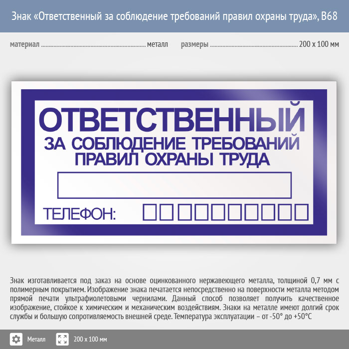 Знак «Ответственный за соблюдение требований правил охраны труда», B68 (металл, 200х100 мм) в Альметьевске купить