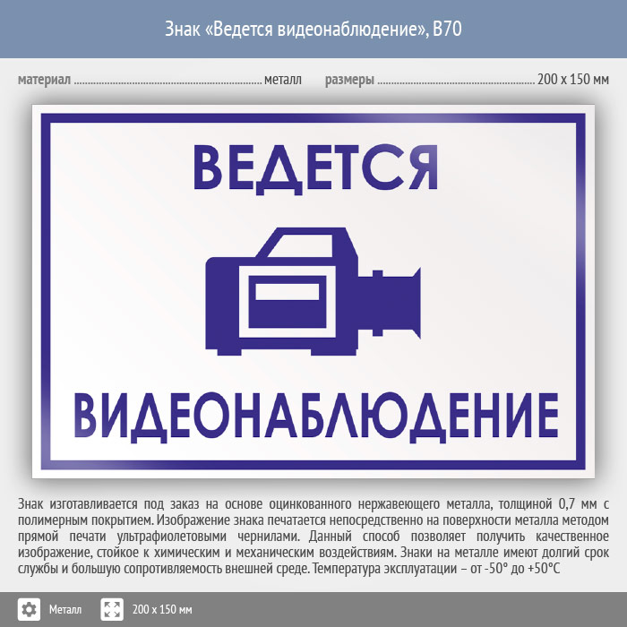 Знак «Ведется видеонаблюдение», B70 (металл, 200х150 мм) в Альметьевске купить
