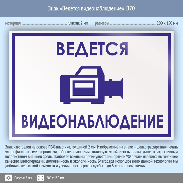 Знак «Ведется видеонаблюдение», B70 (пластик, 200х150 мм) в Альметьевске купить