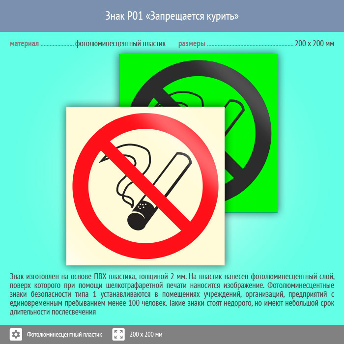 Знак P01 «Запрещается курить» (фотолюминесцентный пластик, 200х200 мм) в Альметьевске купить