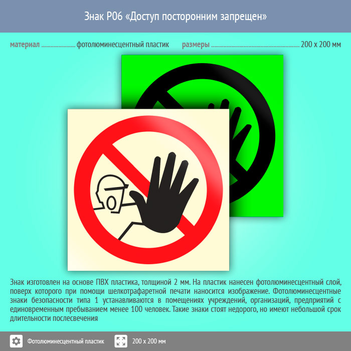Знак P06 «Доступ посторонним запрещен» (фотолюминесцентный пластик, 200х200 мм) в Альметьевске купить