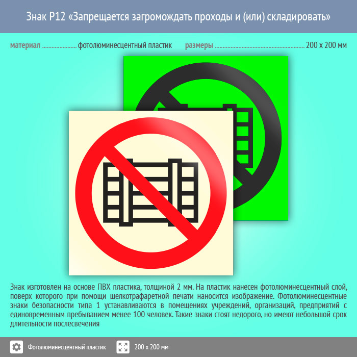 Знак P12 «Запрещается загромождать проходы и (или) складировать» (фотолюминесцентный пластик, 200х200 мм) в Альметьевске купить