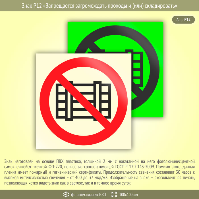 Знак P12 «Запрещается загромождать проходы и (или) складировать» (фотолюминесцентный пластик ГОСТ 34428-2018, 100х100 мм) в Альметьевске купить