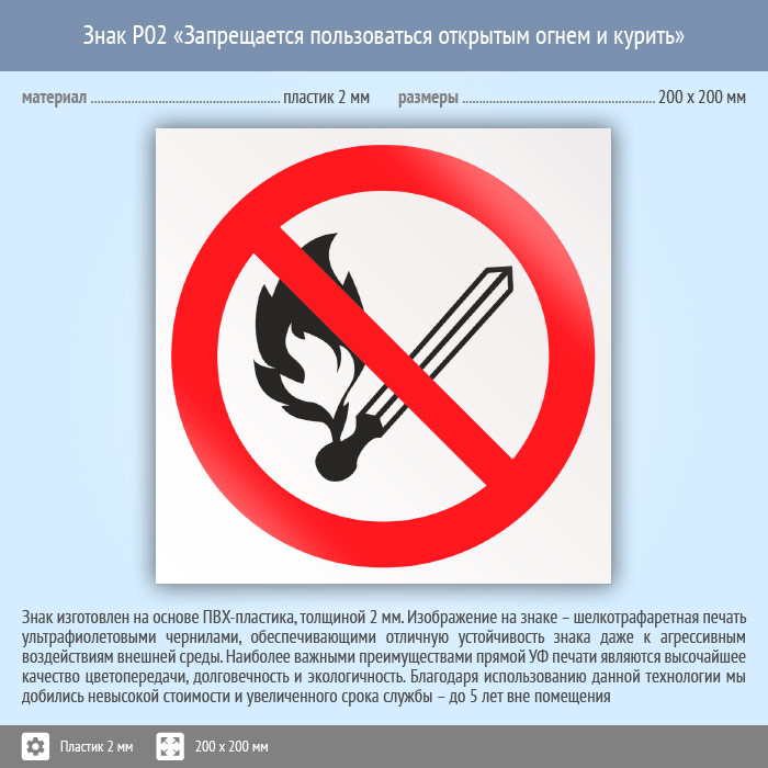 Знак P02 «Запрещается пользоваться открытым огнем и курить» (пластик, 200х200 мм) в Альметьевске купить