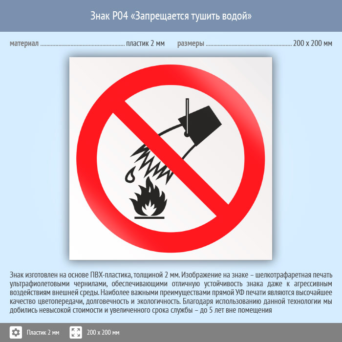 Знак P04 «Запрещается тушить водой» (пластик, 200х200 мм) в Альметьевске купить