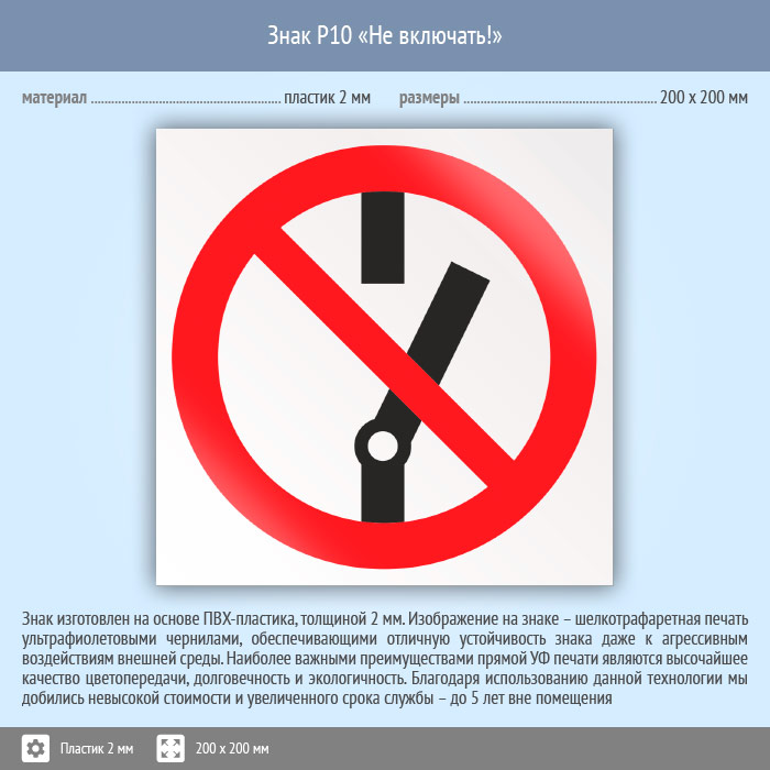Знак P10 «Не включать!» (пластик, 200х200 мм) в Альметьевске купить