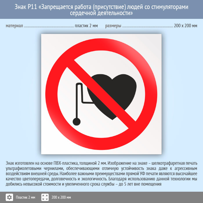Знак P11 «Запрещается работа (присутствие) людей со стимуляторами сердечной деятельности» (пластик, 200х200 мм) в Альметьевске купить
