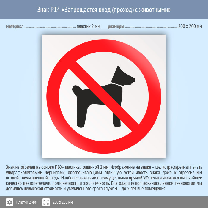 Знак P14 «Запрещается вход (проход) с животными» (пластик, 200х200 мм) в Альметьевске купить