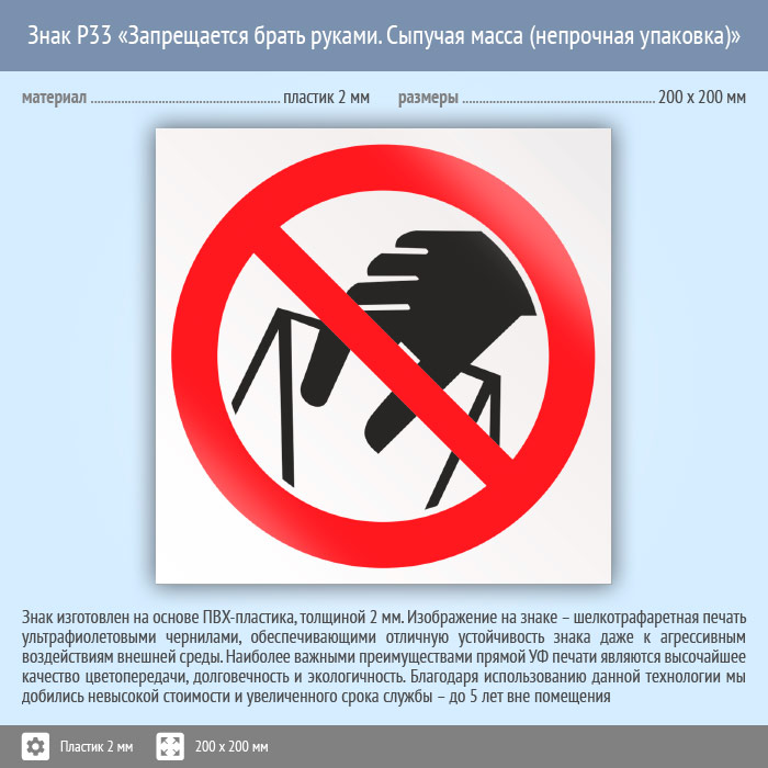 Знак P33 «Запрещается брать руками. Сыпучая масса (непрочная упаковка)» (пластик, 200х200 мм) в Альметьевске купить
