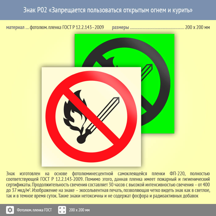 Знак P02 «Запрещается пользоваться открытым огнем и курить» (фотолюминесцентная пленка ГОСТ 34428-2018, 200х200 мм) в Альметьевске купить