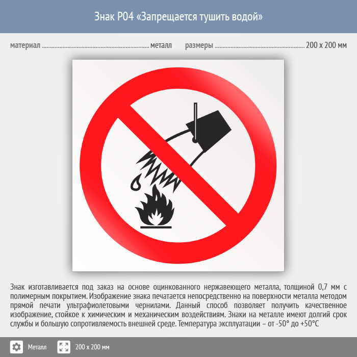Знак P04 «Запрещается тушить водой» (металл, 200х200 мм) в Альметьевске купить