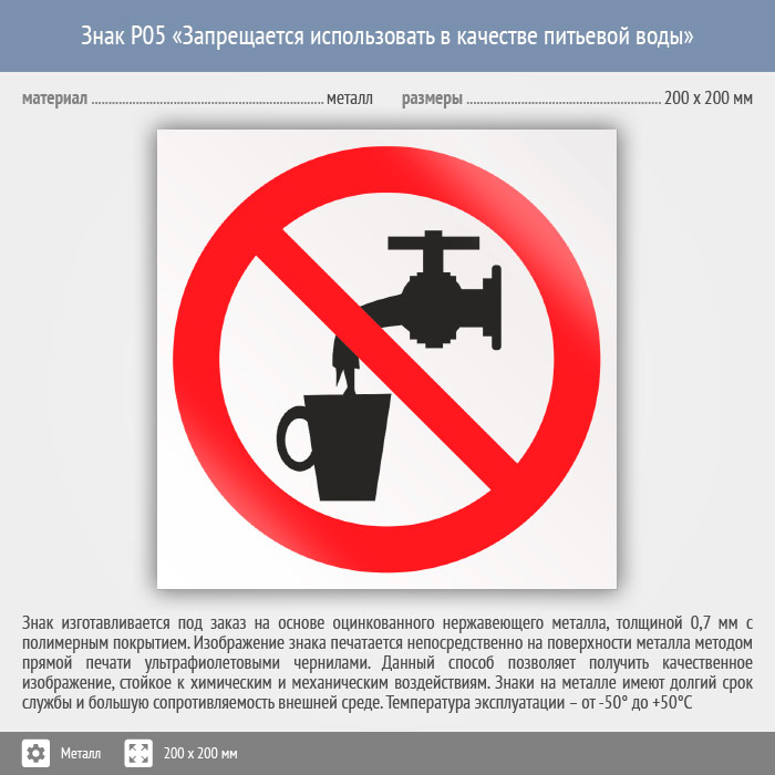 Знак P05 «Запрещается использовать в качестве питьевой воды» (металл, 200х200 мм) в Альметьевске купить