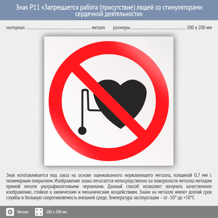 Знак P11 «Запрещается работа (присутствие) людей со стимуляторами сердечной деятельности» (металл, 200х200 мм) в Альметьевске купить