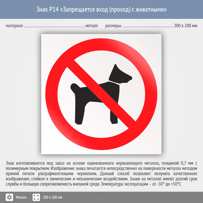 Знак P14 «Запрещается вход (проход) с животными» (металл, 200х200 мм) в Альметьевске купить