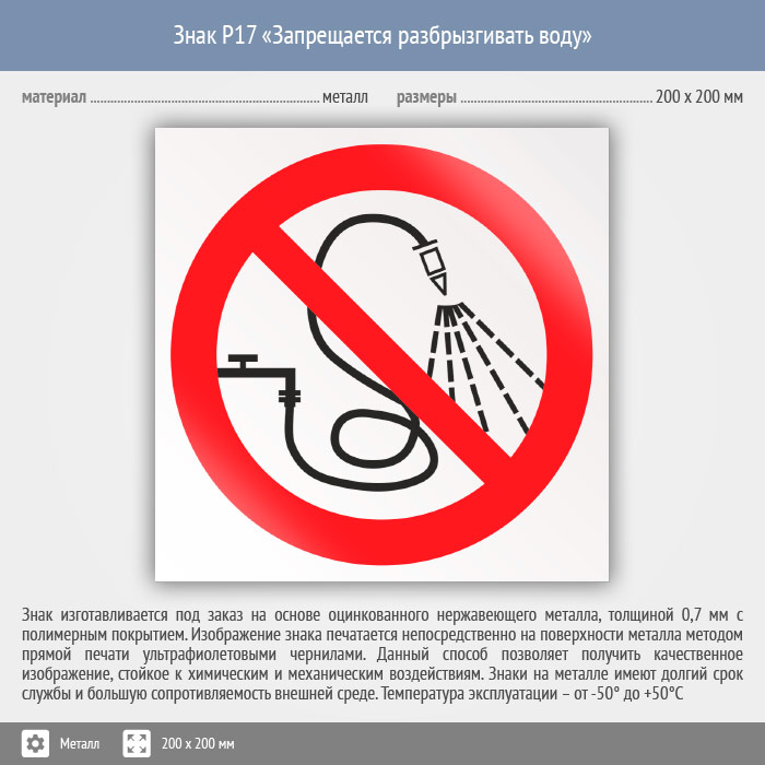 Знак P17 «Запрещается разбрызгивать воду» (металл, 200х200 мм) в Альметьевске купить