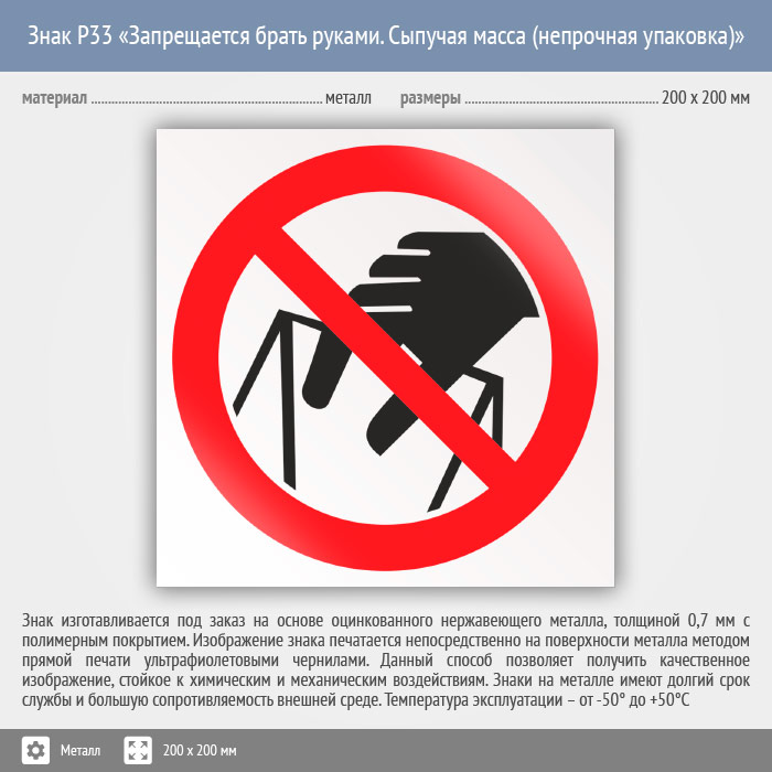 Знак P33 «Запрещается брать руками. Сыпучая масса (непрочная упаковка)» (металл, 200х200 мм) в Альметьевске купить