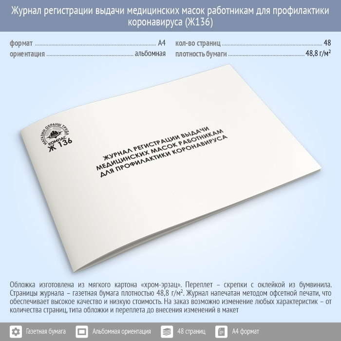 Журнал регистрации выдачи медицинских масок работникам для профилактики коронавируса (48 стр., Ж136) в Альметьевске купить
