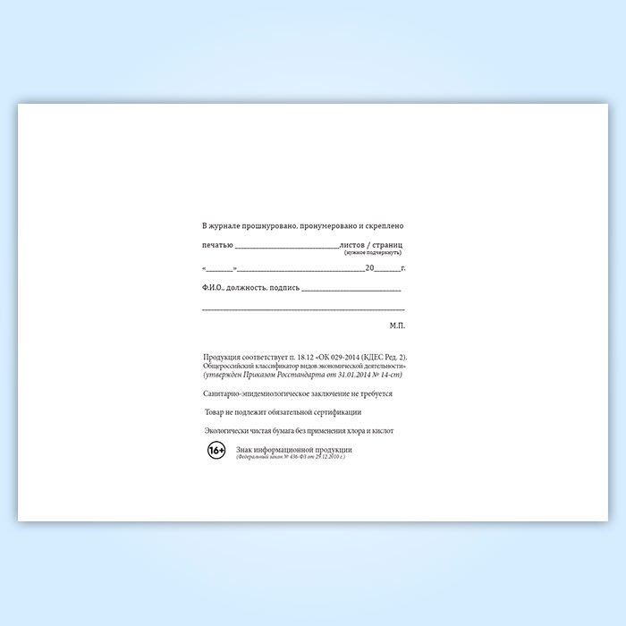 Вы получаете печатную продукцию прошнурованной и c местом для вашей печати в соответствии с действующими нормативными документами: