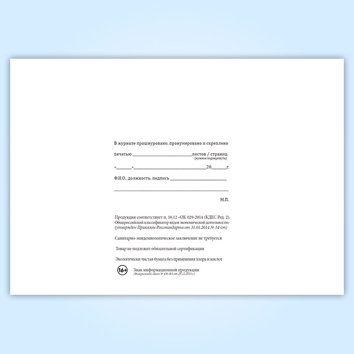 Вы получаете печатную продукцию прошнурованной и c местом для вашей печати в соответствии с действующими нормативными документами: