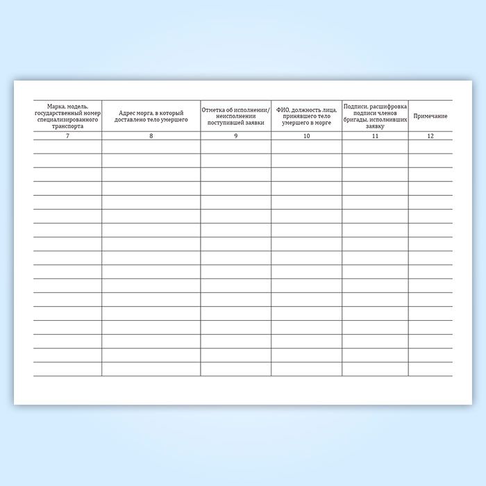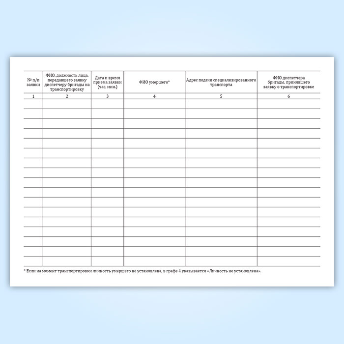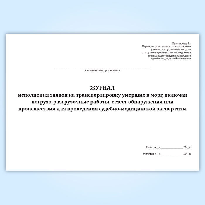 Журнал исполнения заявок на транспортировку умерших в морг, включая погрузо-разгрузочные работы, с мест обнаружения или происшествия для проведения судебно-медицинской экспертизы в Альметьевске купить