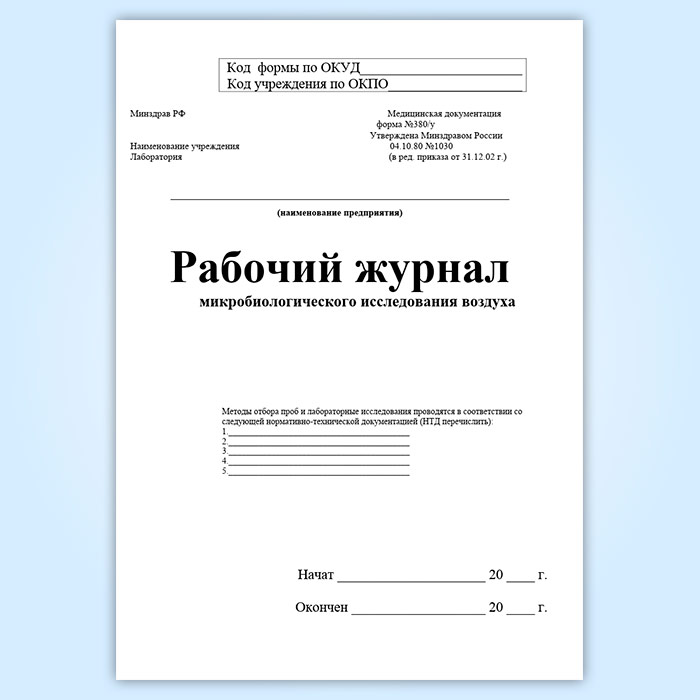Рабочий журнал микробиологического исследования воздуха (форма 380/у) в Альметьевске купить