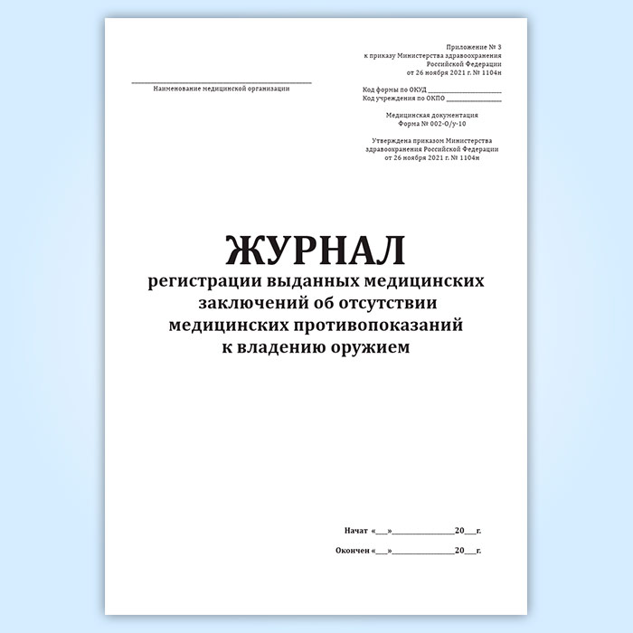 Журнал регистрации выданных медицинских заключений об отсутствии медицинских противопоказаний к владению оружием (форма 002-О/У-10) в Альметьевске купить