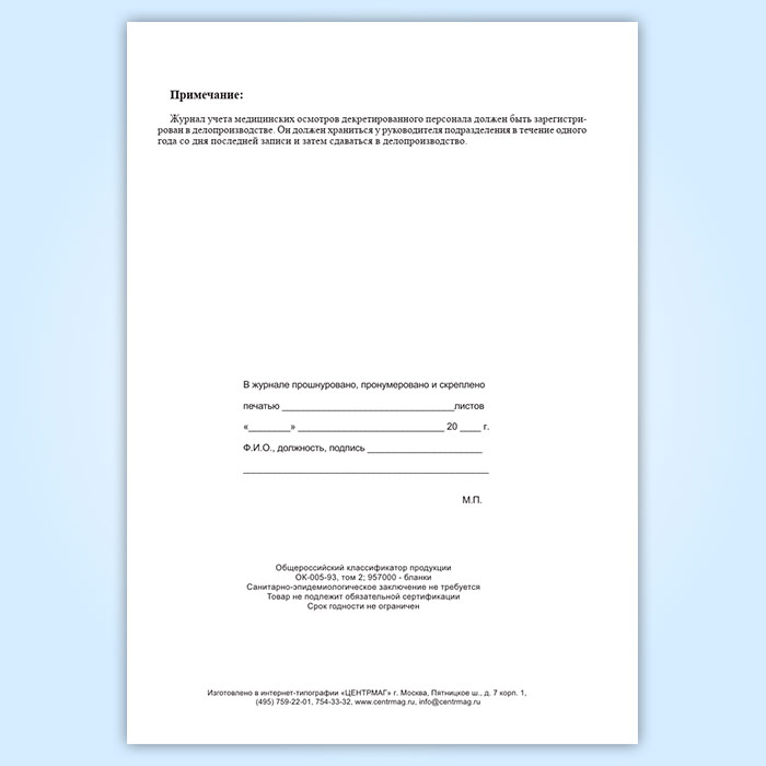 Журнал учета медицинских осмотров декретированного персонала в Альметьевске купить