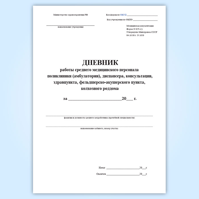 Дневник работы среднего медицинского персонала поликлиники (амбулатории), диспансера, консультации, здравпункта, фельдшерско-акушерского пункта, колхозного роддома (форма 039-1/у) в Альметьевске купить