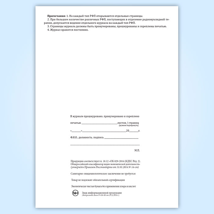 Приходно-расходный журнал учета радиофармпрепаратов, поступающих в подразделение радионуклидной терапии в готовом виде для непосредственного введения в организм пациента в Альметьевске купить