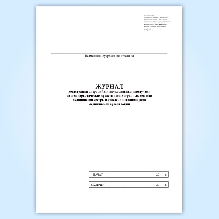 Журнал регистрации операций с использованными ампулами из-под наркотических средств и психотропных веществ медицинской сестры в отделении стационарной медицинской организации в Альметьевске купить