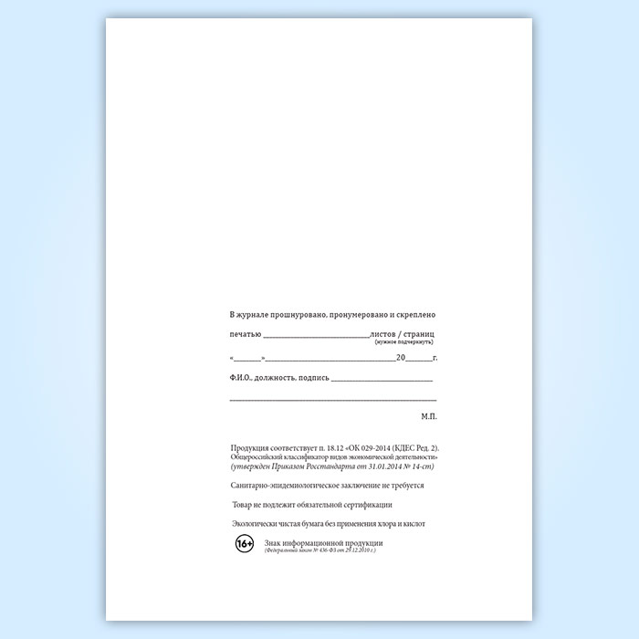 Вы получаете печатную продукцию прошнурованной и c местом для вашей печати в соответствии с действующими нормативными документами: