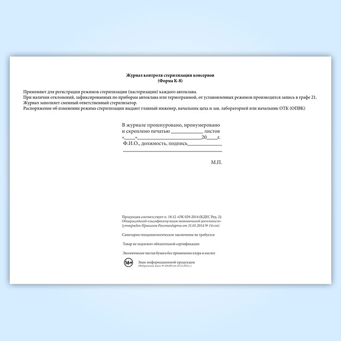 Журнал контроля стерилизации консервов (форма К-8) в Альметьевске купить