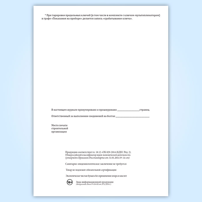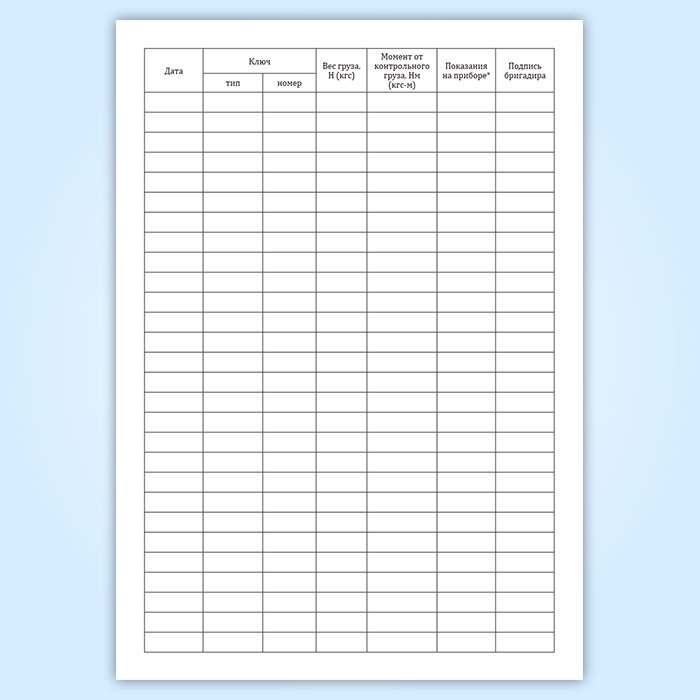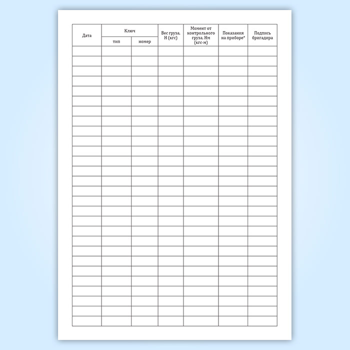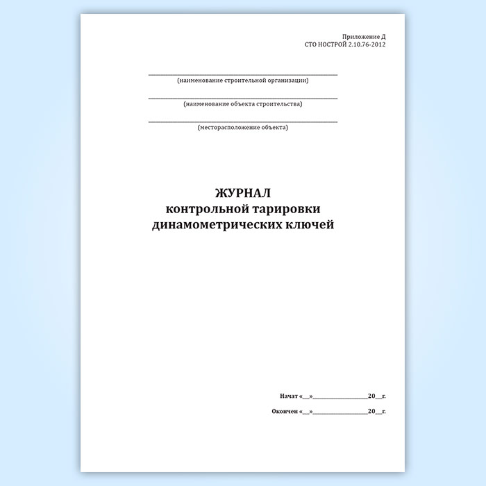 Журнал контрольной тарировки динамометрических ключей (СТО НОСТРОЙ 2.10.76-2012) в Альметьевске купить