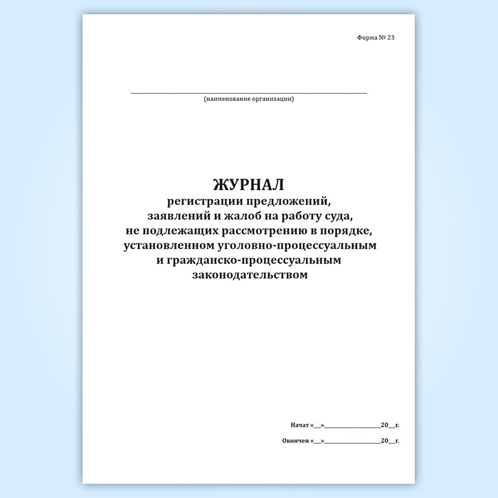 Журнал регистрации предложений, заявлений и жалоб на работу суда, не подлежащих рассмотрению в порядке, установленном уголовно-процессуальным и гражданско-процессуальным законодательством (форма № 23) в Альметьевске купить