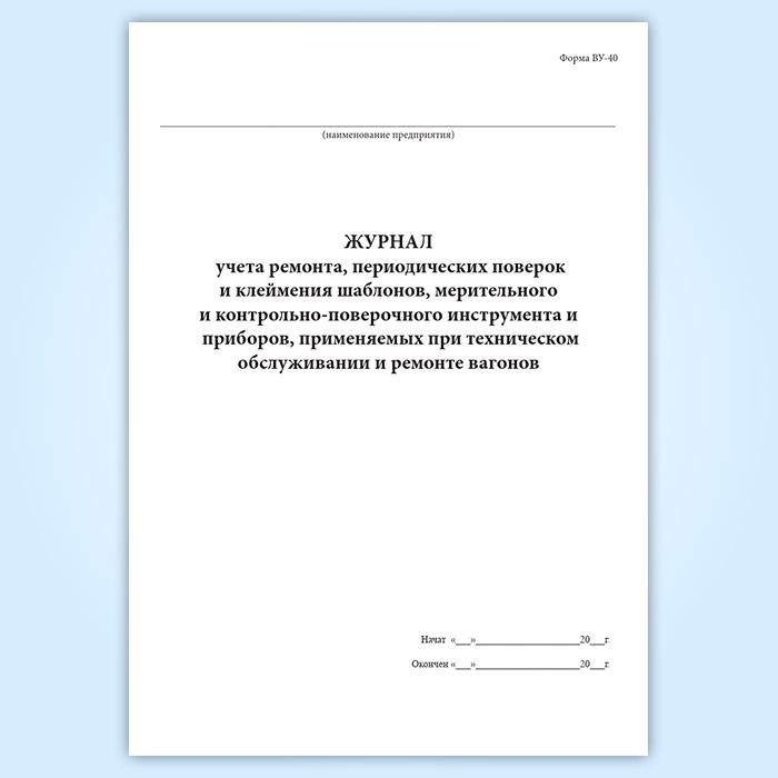 Журнал учета ремонта, периодических поверок и клеймения шаблонов, мерительного и контрольно-поверочного инструмента и приборов, применяемых при техническом обслуживании и ремонте вагонов (форма ВУ-40) в Альметьевске купить