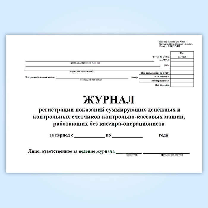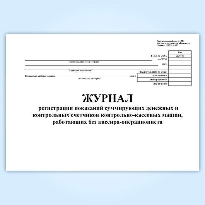 Журнал регистрации показаний суммирующих денежных и контрольных счетчиков контрольно-кассовых машин, работающих без кассира-операциониста (форма КМ-5) в Альметьевске купить