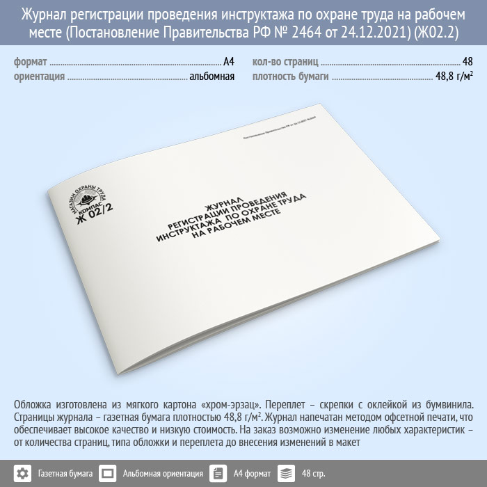 Журнал регистрации проведения инструктажа по охране труда на рабочем месте (Постановление Правительства РФ № 2464 от 24.12.2021) (48 стр., Ж02.2) в Альметьевске купить