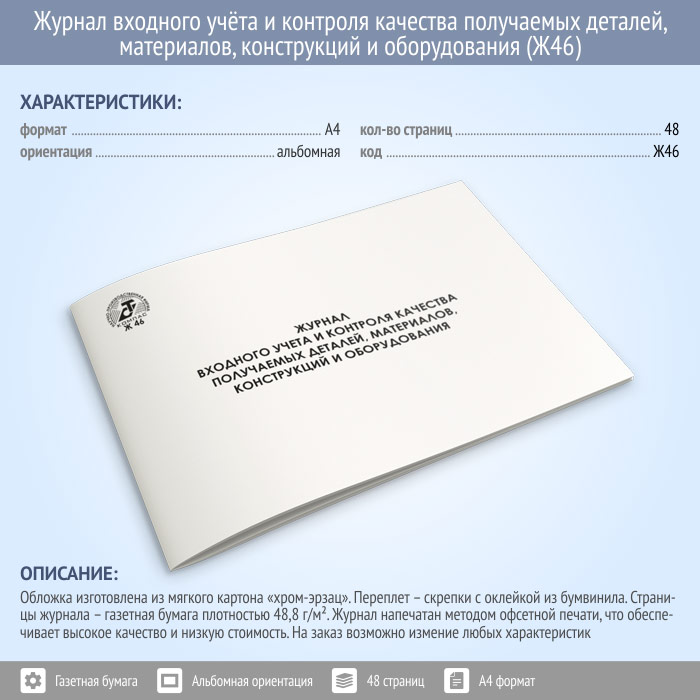 Журнал входного учета и контроля качества получаемых деталей, материалов, конструкций и оборудования (48 стр., Ж46) в Альметьевске купить