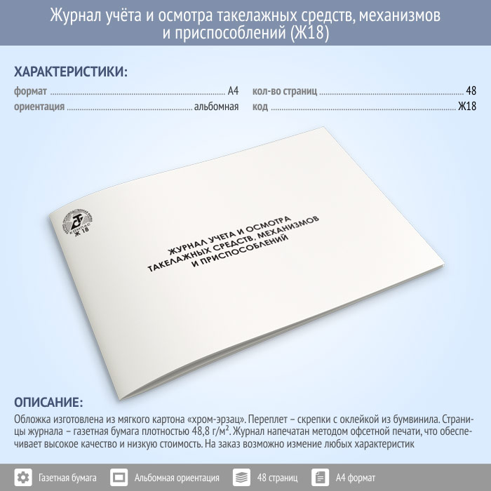 Журнал учета и осмотра такелажных средств, механизмов и приспособлений (48 стр., Ж18) в Альметьевске купить